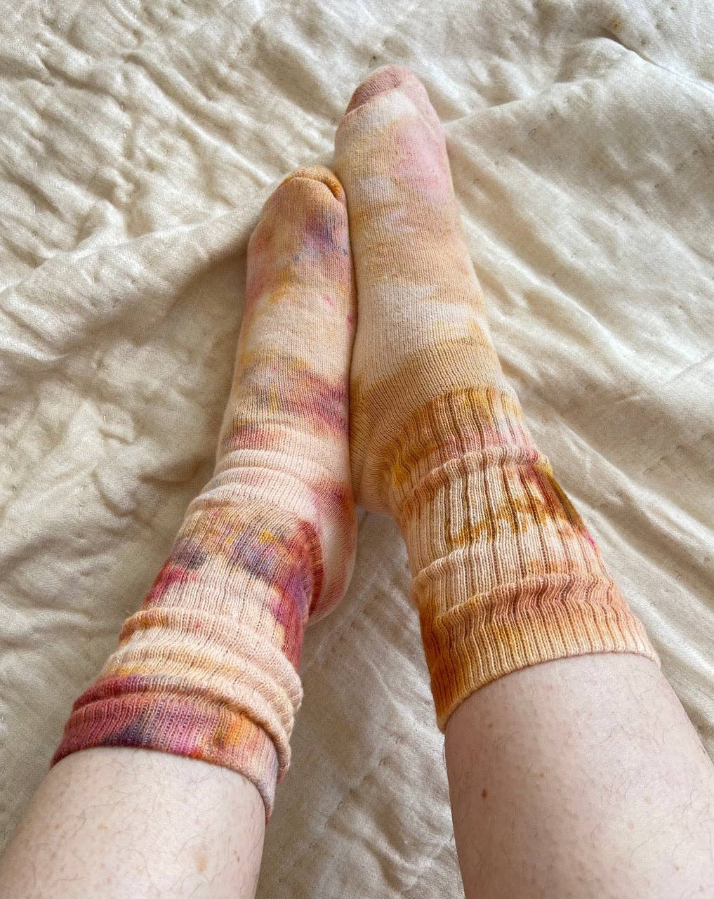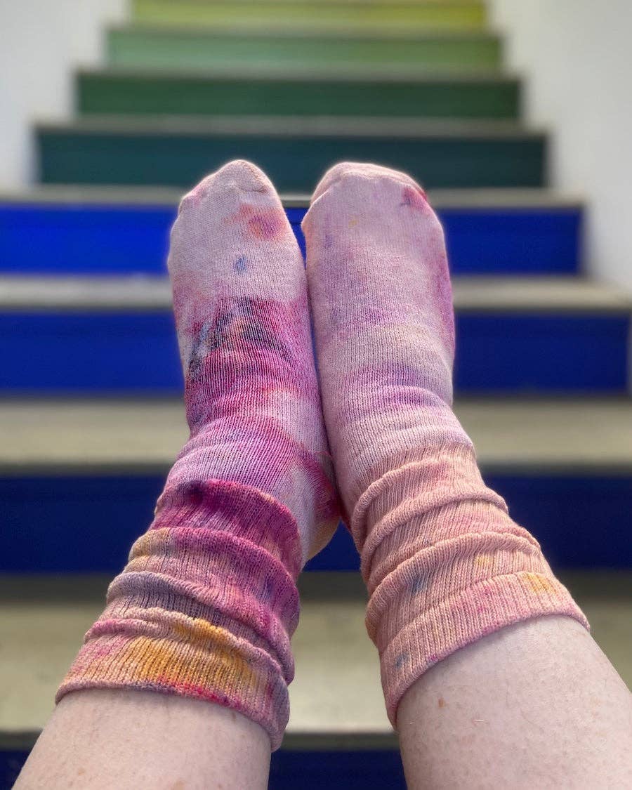 Soft. Cozy. and Sustainably Made! Organic Cotton Tube Socks—crafted with love and care. 🌱 Organic & USA-Made: Made with 85% organic cotton grown and produced in the USA. complemented by 10% stretch nylon and 5% elastic for durability and a perfect fit. 💫 Hand-Dyed Magic: Each pair is hand-dyed in our open-air backyard studio. where nature plays its part in creating truly one-of-a-kind socks. The temperature. breeze. and even the sunlight influence the unique patterns. making every pair special and unrepeatable. 👟 Comfort Meets Style: Soft. cozy and one of a kind. The perfect pop of color for completing your look. Whether you’re staying in or stepping out. they add the perfect touch to your wardrobe. Tie Dye socks in beautiful earthy colors. pink. yellow. orange. green. blue. brown. clay. purple and everything in between.